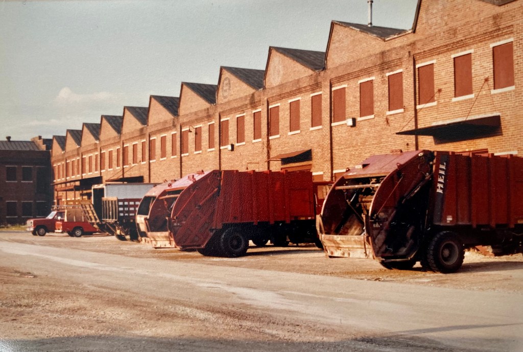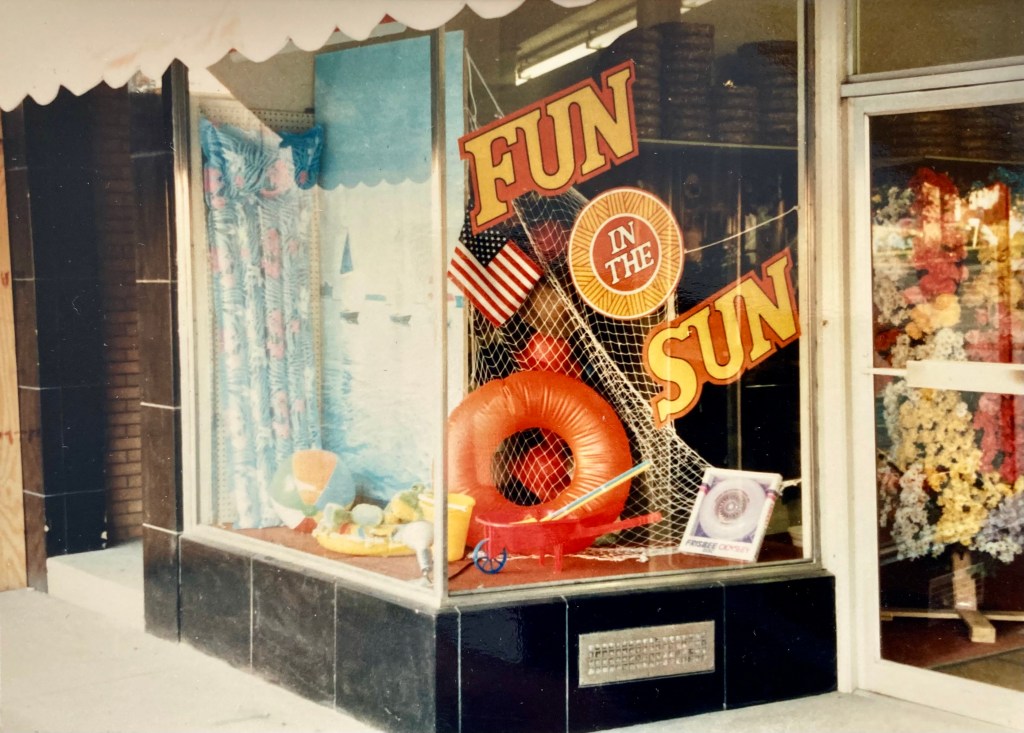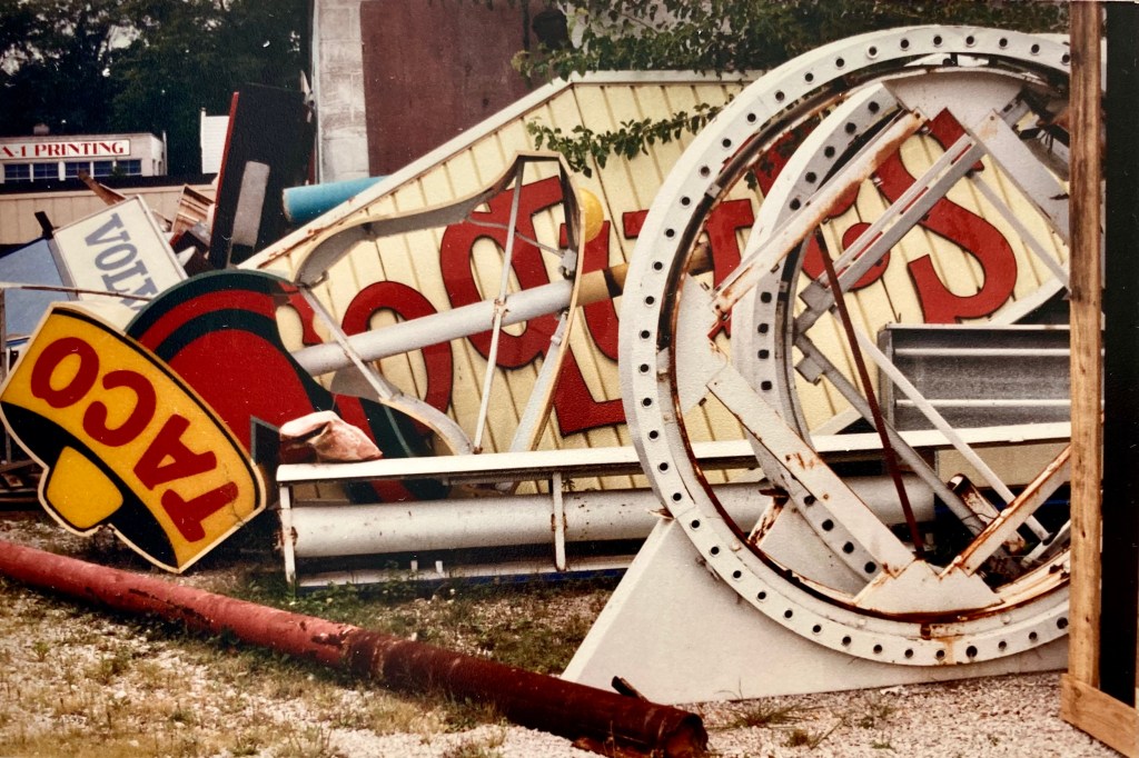 As I pressed the shutter release, I was struck by the small-town Americana vibe of this tableau. I also remember thinking, very clearly, that while most people would not find the image particularly interesting at that moment, it might be seen quite differently in forty or fifty years—a span of time difficult for me to even imagine at that age. I spent the next hour or two wandering central Bloomington, eventually exposing some twenty frames—a conservative number by today’s standards, but film processing was a luxury in those days on a college student’s budget. My subjects included the old Showers furniture factory, with garbage trucks lined up before it like hogs feeding at the trough; a window display exhorting passersby to have “Fun in the Sun”; and a graveyard of once-illuminated signs from defunct businesses—a museum of capitalist ruin.